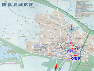 城区图中符号说明: (一)是校长办公室报名点胜德大楼楼下 (二)是世全车队报名点 (三)是交警队大门正对面驾校门市报名点 (四)是世全汽贸报名点 (五)是摩托车训练场 (六)是光荣停车场报名点、轿车培训基地老汽车站对面 (七)往宜宾方向至汤元店收费处是大车培训基地